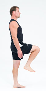 - Lift one leg by bending at the knee and lifting the foot. Stand on the other foot.