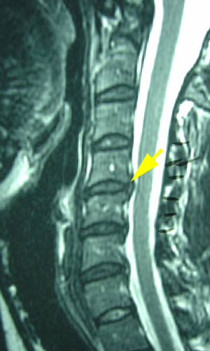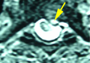Figure 4 shows an MRI image of a cervical spine disc herniation from the top (See arrow.) as it moves backward and contacts the spinal cord which is implicated as a cause of headache.