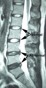 - compression of the spinal nerve root via the escape of the fluid of the nucleus pulposus' center (disc herniation / non-contained disc) that chemically or mechanically presses on the nerve