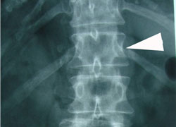 Thoracic spine subluxations can irritate the nerves of the disc, facet joints, and spinal nerves leaving the spine to cause pain in the mid-back that may even be felt around the sides and into the chest. At arrow, note the rotation subluxation which is an off-centering or rotation of the vertebra.
