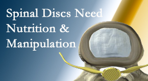 Now how does the disc get its nutrients? From the blood supply via the outer edges of the disc which butt up to the endplates of the bone of the vertebral bodies above and below. (2) This is called diffusion. These edges must be healthy, too, so the flow is unimpeded. (3) That’s where spinal manipulation comes into play.
