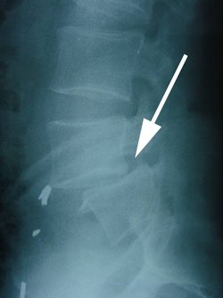 arthritis of the facet joints, the joints between the vertebral bones where motion of the spine takes place. As a vertebra slips forward (white arrow), the disc causes pain because